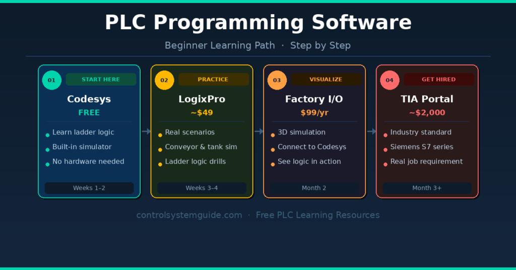 When choosing PLC programming software for beginners, the best approach is:: Start with Codesys (free) → Practice with LogixPro or Factory I/O → Learn TIA Portal or Studio 5000 based on your target industry.